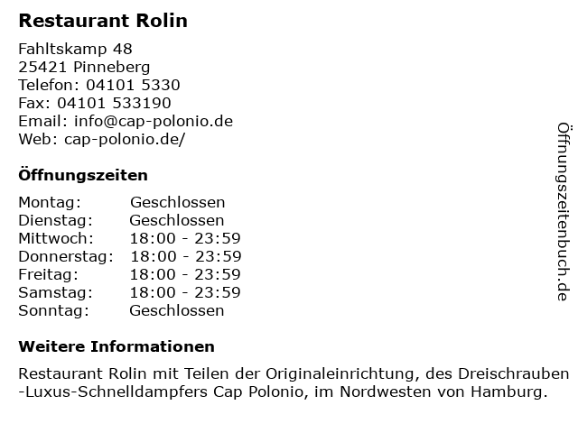 | Öffnungszeiten Restaurant Rolin in Pinneberg anzeigen | |