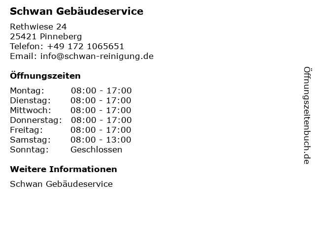 | Öffnungszeiten Schwan Gebäudeservice in Pinneberg anzeigen | |