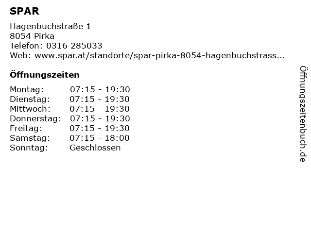 | Öffnungszeiten SPAR in Pirka anzeigen | |