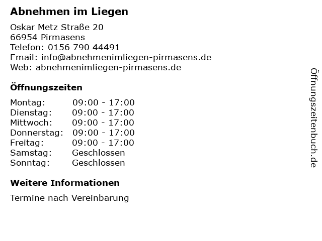 | Öffnungszeiten Abnehmen im Liegen in Pirmasens anzeigen | |