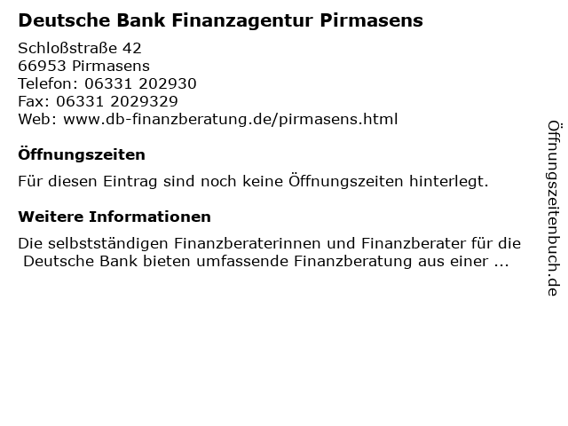 | Deutsche Bank Finanzagentur Pirmasens anrufen | |