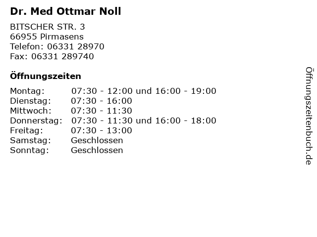 | Öffnungszeiten Dr. Med Ottmar Noll in Pirmasens anzeigen | |