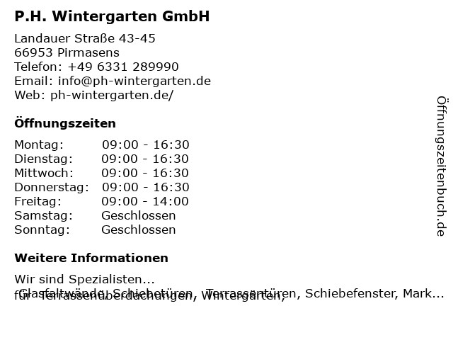 | Öffnungszeiten P.H. Wintergarten GmbH in Pirmasens anzeigen | |