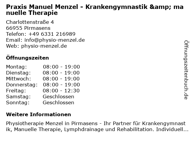 3 Malgorzata Kuczelinis Praxis für Krankengymnastik (Entfernung: 1,07 km) Bahnhofstr. 6, 66953 Pirmasens 4 Krankengymnastik u. manuelle Therapie Andrea Becker und Erik Sliepen (Entfernung: 1,18 km) Luisenstr. 19, 66953 Pirmasens 6 Petra Naruhn-Villwock Krankengymnastik (Entfernung: 7,91 km) Pirmasenser Str. 8, 66987 Thaleischweiler-Fröschen |
