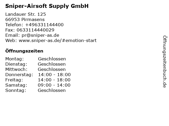 | Öffnungszeiten Sniper-Airsoft Supply GmbH in Pirmasens anzeigen | |