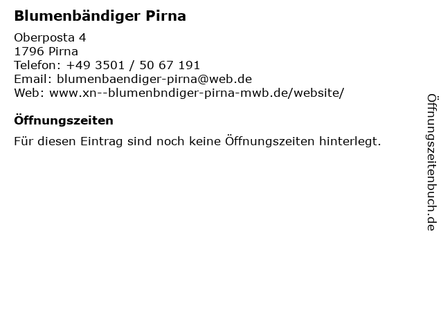 | Öffnungszeiten Blumenbändiger Pirna in Pirna anzeigen | |