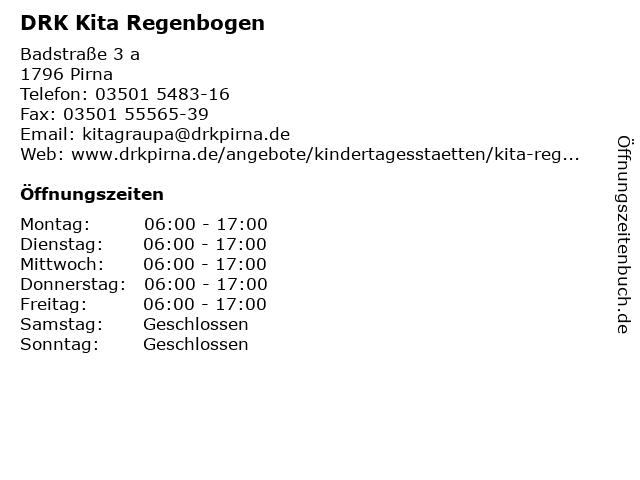 | Öffnungszeiten DRK Kita Regenbogen in Pirna anzeigen | |
