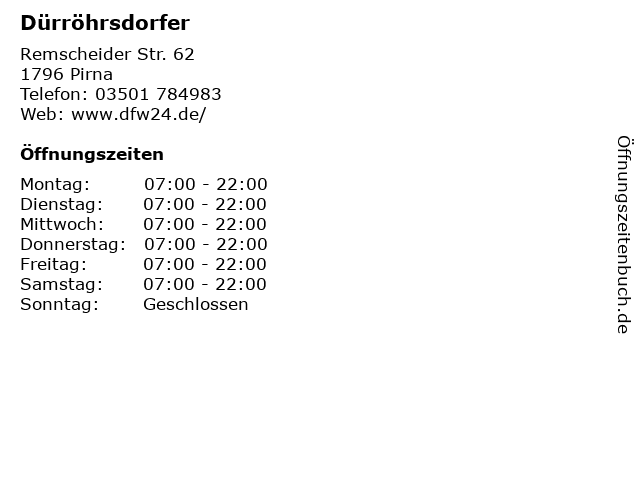 | Öffnungszeiten Dürröhrsdorfer in Pirna anzeigen | |