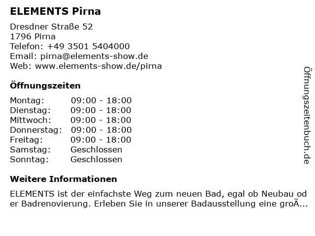 | Öffnungszeiten ELEMENTS Pirna in Pirna anzeigen | |