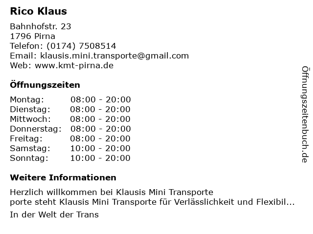 | Öffnungszeiten Rico Klaus in Pirna anzeigen | |