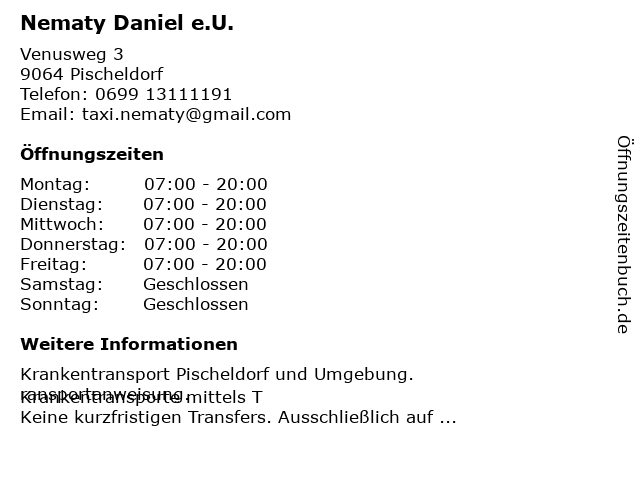 | Öffnungszeiten Nematy Daniel e.U. in Pischeldorf anzeigen | |