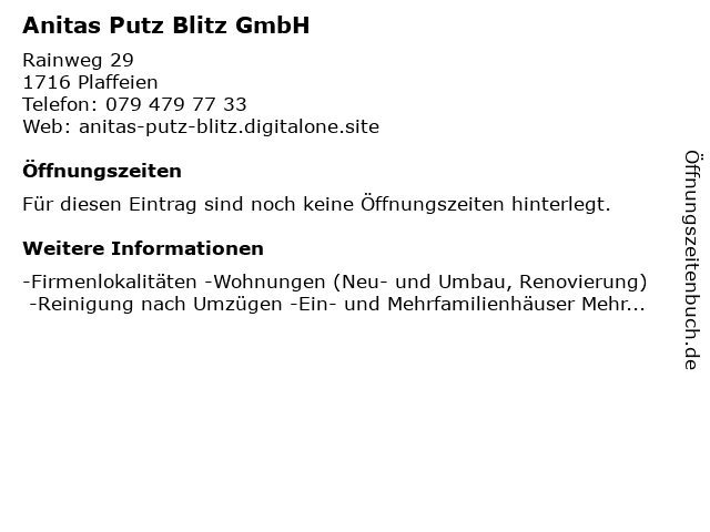 | Öffnungszeiten Anitas Putz Blitz GmbH in Plaffeien anzeigen | |