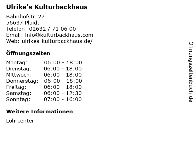 | Öffnungszeiten Ulrike's Kulturbackhaus in Plaidt anzeigen | |