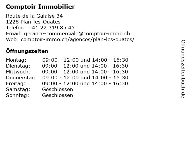 | Öffnungszeiten Comptoir Immobilier in Plan-les-Ouates anzeigen | |