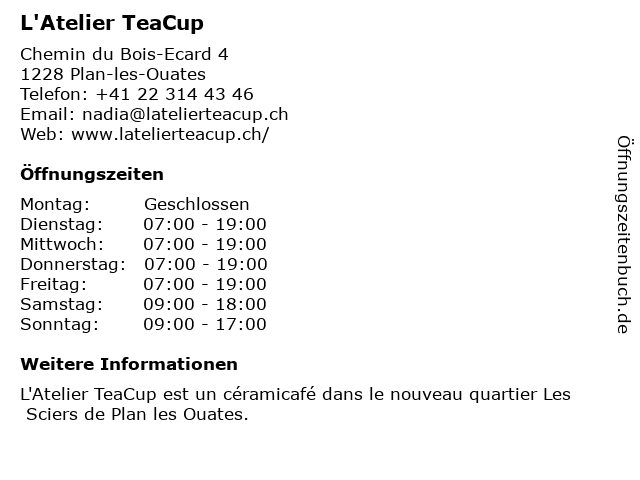 | Öffnungszeiten L'Atelier TeaCup in Plan-les-Ouates anzeigen | |