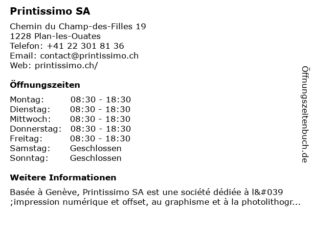 | Öffnungszeiten Printissimo SA in Plan-les-Ouates anzeigen | |