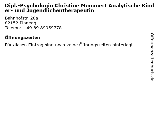 | Dipl.-Psychologin Christine Memmert Analytische Kinder- und Jugendlichentherapeutin anrufen | |