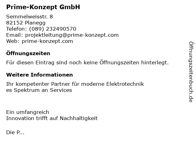 | Öffnungszeiten Prime-Konzept GmbH in Planegg anzeigen | |