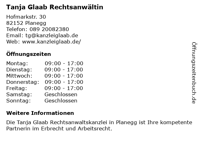 | Öffnungszeiten Tanja Glaab Rechtsanwältin in Planegg anzeigen | |