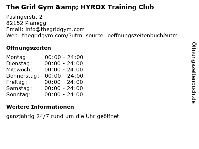 | Öffnungszeiten The Grid Gym & HYROX Training Club in Planegg anzeigen | |