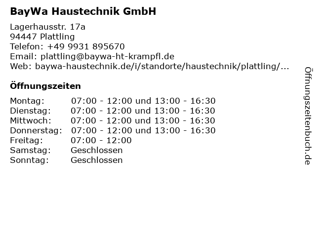 | Öffnungszeiten BayWa Haustechnik GmbH in Plattling anzeigen | |
