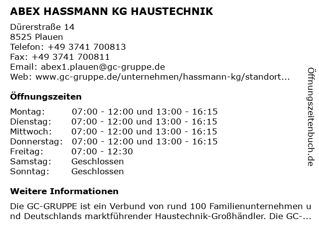 | Öffnungszeiten ABEX HASSMANN KG HAUSTECHNIK in Plauen anzeigen | |