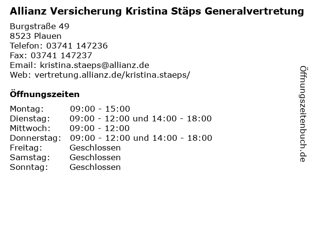 1 2 Allianz Versicherung Jörg Köstner Generalvertretung (Entfernung: 0,84 km) Eugen-fritsch-straße 2, 08523 Plauen 3 Mecklenburgische Versicherungsgruppe - Generalvertretung Günter Schuberth (Entfernung: 1,02 km) Julius-Fucik-Str. 25, 08523 Plauen 5 Allianz Versicherung Jens Rzezak Generalvertretung (Entfernung: 1,84 km) Haselbrunner Straße 65, 08525 Plauen 6 Allianz Versicherung Steffen Markert Generalvertretung (Entfernung: 1,86 km) Geibelstraße 44, 08525 Plauen |