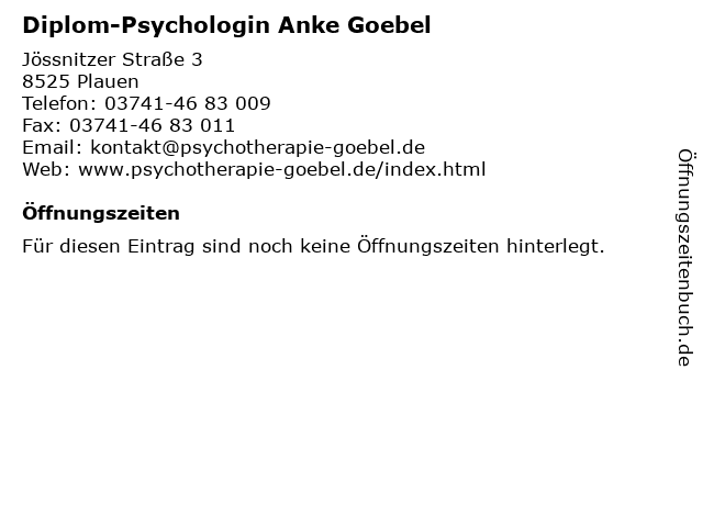 1 Dipl.-Psych. univ. Anke Goebel - Kinder- und Jugendlichenpsychotherapeutin (Entfernung: 0,01 km) Jössnitzer Straße 3, 08523 Plauen 6 JEMAKO International GmbH - Vertriebspartner Anke Haase (Entfernung: 13,22 km) Ortsstr. 46 b, 07952 Pausa-Mühltroff |