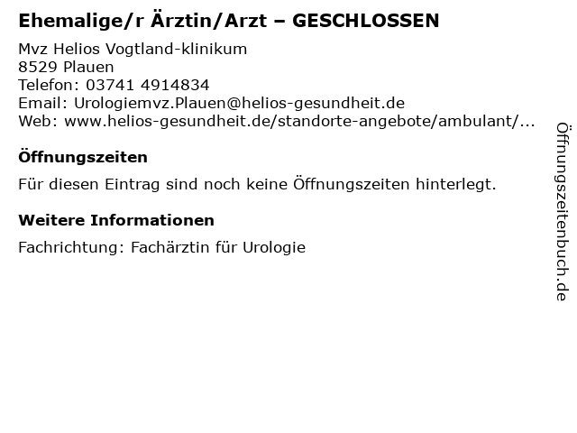 1 Ehemalige/r Ärztin/Arzt – GESCHLOSSEN (Entfernung: 0,20 km) Mvz Helios Vogtland-klinikum , 08529 Plauen 4 Dr. med. Berthold Kern - Ärztin für Allgemeinmedizin (Entfernung: 3,03 km) Alte Plauener Straße 11, 08541 Plauen 6 |