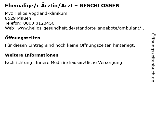 1 Ehemalige/r Ärztin/Arzt – GESCHLOSSEN (Entfernung: 0,09 km) Mvz Helios Vogtland-klinikum , 08529 Plauen 6 |