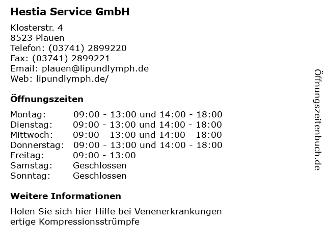 | Öffnungszeiten Hestia Service GmbH in Plauen anzeigen | |