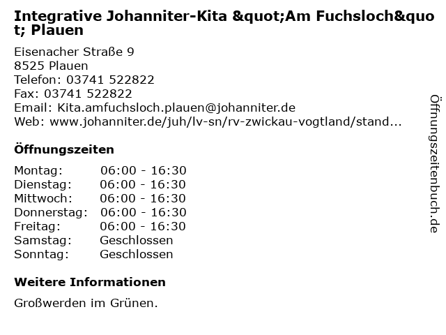 Branchen & Suchbegriffe zu Integrative Johanniter-Kita "Am Fuchsloch" Plauen:"am, agentur für kinderbetreuung, fuchsloch", gemeinnützige organisation, hilfsorganisation, integrative, johanniter, kita, plauen, sozialarbeit, verband, wohlfahrtseinrichtung |