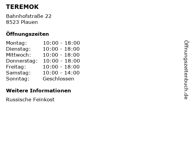 | Öffnungszeiten TEREMOK in Plauen anzeigen | |