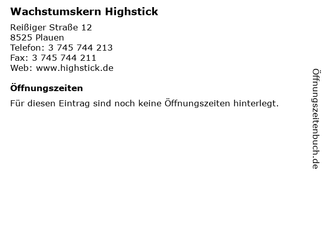 | Öffnungszeiten Wachstumskern Highstick in Plauen anzeigen | |