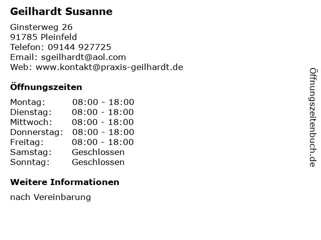 | Öffnungszeiten Geilhardt Susanne in Pleinfeld anzeigen | |
