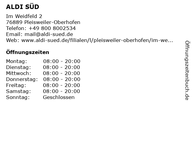 | Öffnungszeiten ALDI SÜD in Pleisweiler-Oberhofen anzeigen | |