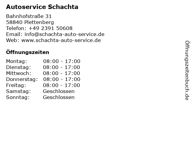 | Öffnungszeiten Autoservice Schachta in Plettenberg anzeigen | |