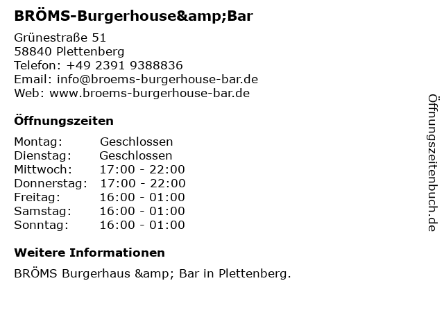 | Öffnungszeiten BRÖMS-Burgerhouse&Bar in Plettenberg anzeigen | |