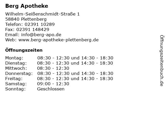 | Öffnungszeiten Berg Apotheke in Plettenberg anzeigen | |