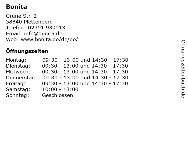 | Öffnungszeiten Bonita in Plettenberg anzeigen | |