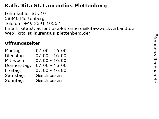1 Pfarrbüro Kath. Kirchengemeinde St. Laurentius (Entfernung: 0,11 km) Lehmkuhler Straße 5, 58840 Plettenberg 2 Kath.Hauptschule-Kardinal-von- Galen-Schule (Entfernung: 8,67 km) Wiesbadener Str. 10, 57439 Attendorn 5 St. Laurentius-Schule Förderschule für geistige Entwicklung (Entfernung: 10,06 km) Kölner Str. 46a, 57439 Attendorn 6 |