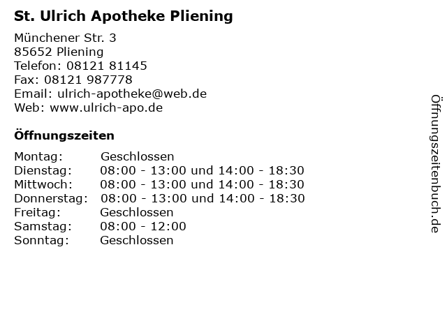 | Öffnungszeiten St. Ulrich Apotheke Pliening in Pliening anzeigen | |