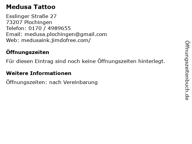| Öffnungszeiten Medusa Tattoo in Plochingen anzeigen | |