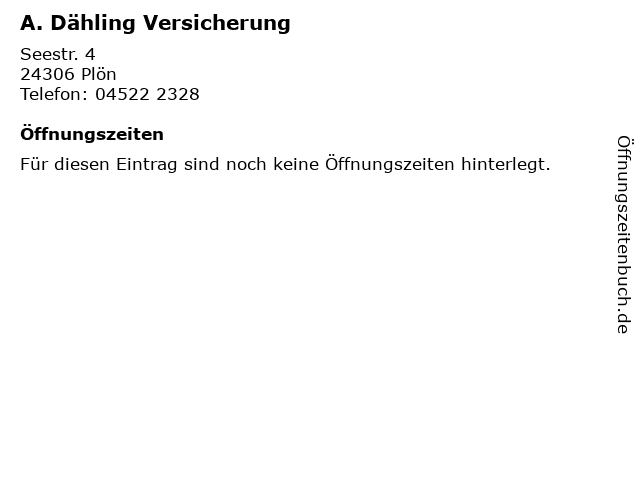| Öffnungszeiten A. Dähling Versicherung in Plön anzeigen | |