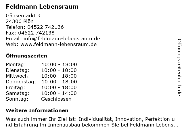 | Öffnungszeiten Feldmann Lebensraum in Plön anzeigen | |