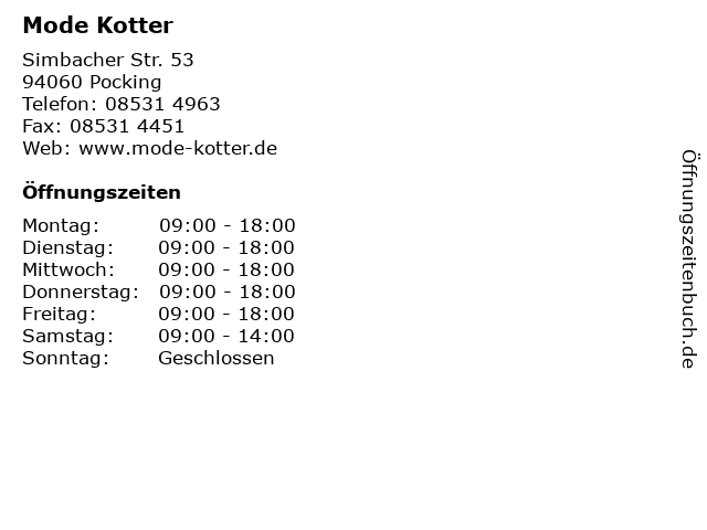 | Öffnungszeiten Mode Kotter in Pocking anzeigen | |