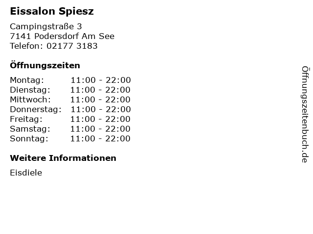 | Öffnungszeiten Eissalon Spiesz in Podersdorf Am See anzeigen | |