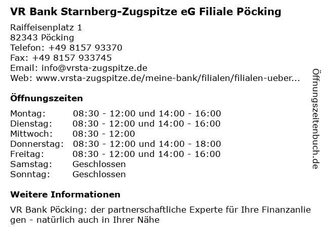 Branchen & Suchbegriffe zu VR Bank Starnberg-Zugspitze eG Filiale Pöcking:bank, baufinanzierung, beratung, eg, geldanlage, geldautomat, genossenschaft, girokonto, immobilien, kredit, pöcking, versicherung, vr, zugspitze |