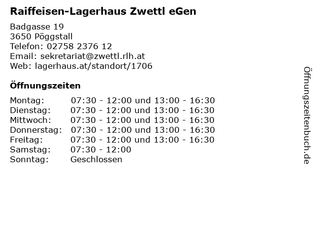 3 SPAR Supermarkt - Raiffeisen-Lagerhaus Zwettl eGen - Haus & Garten (Entfernung: 0,02 km) Badgasse 19, 3650 Pöggstall 4 Raiffeisen-Lagerhaus Zwettl eGen - Genol Tankstelle (Entfernung: 10,32 km) Hauptstraße 81, 3683 Altenmarkt im Yspertal 5 Raiffeisen-Lagerhaus Zwettl eGen - Baustoffhandel (Entfernung: 10,35 km) Hauptstraße 81, 3683 Yspertal 6 Raiffeisen-Lagerhaus Zwettl eGen - Brennstoffhandel (Entfernung: 10,35 km) Hauptstraße 81, 3683 Yspertal |