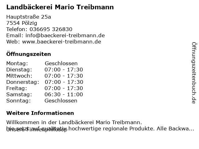 | Öffnungszeiten Landbäckerei Mario Treibmann in Pölzig anzeigen | |